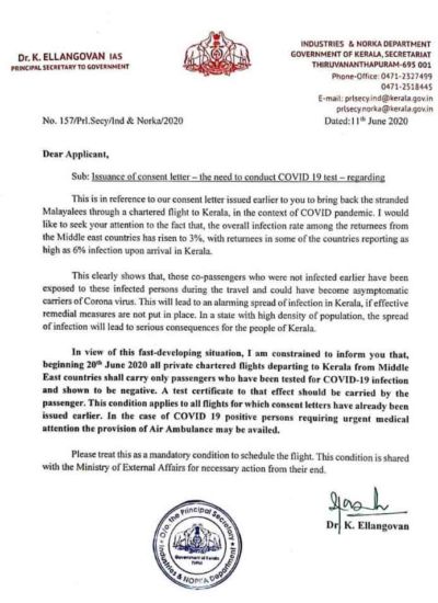 തിരുവനന്തപുരം: മിഡില് ഈസ്റ്റില് നിന്ന് വരുന്നവര് കോവിഡ് 19 രോഗവ്യാപനത്തിന് കാരണമാകുന്നുവെന്നും ഇനി മുതല് കോവിഡ് പരിശോധന നടത്തി നെഗറ്റീവ് ആണെന്ന സര്ട്ടിഫിക്കറ്റുമായി മാത്രമേ കേരളത്തിലേക്ക് യാത്ര അനുവദിക്കൂവെന്നും നോര്ക്ക പ്രിന്സിപ്പല് സെക്രട്ടറി ഡോ. കെ. ഇളങ്കോവന്റെ കത്ത്. ചാര്ട്ടര് ചെയ്ത വിമാനത്തില് കേരളത്തിലേക്ക് വരാന് രജിസ്റ്റര് ചെയ്ത് പ്രവാസികള്ക്കാണ് കത്ത് ലഭിച്ചിരിക്കുന്നത്.