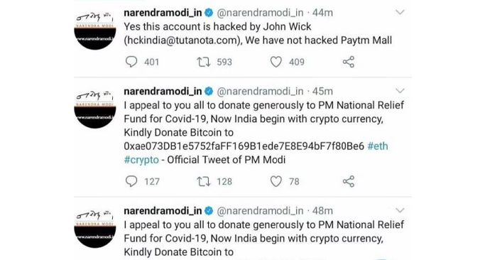 പ്രധാനമന്ത്രിയുടെ ദുരിതാശ്വാസ നിധിയിലേക്ക് ക്രിപ്റ്റോ കറന്സി വഴി സംഭാവന നല്കണമെന്നാണ് ട്വീറ്റുകളില് പറയുന്നത്. 2.5 മില്യണ് ഫോളോവേഴ്സുള്ള അക്കൗണ്ടാണ് ഹാക്ക് ചെയ്തത്. എന്നാല്, മിനിറ്റുകള്ക്കകം തന്നെ ട്വീറ്റ് അക്കൗണ്ടില് നിന്ന് നീക്കം ചെയ്തു.