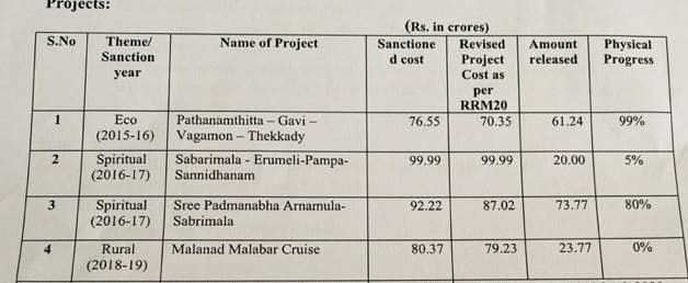 2016-17 മുതല്‍ 2018-19 വരെയുള്ള കാലയളവില്‍ അനുവദിച്ച 427 കോടി രൂപയുടെ മറ്റ് അഞ്ചു പദ്ധതികളുടെ നടത്തിപ്പില്‍ സംസ്ഥാനസര്‍ക്കാര്‍ വലിയ വീഴ്ച വരുത്തി. 99.99 കോടിയുടെ ശബരിമല പദ്ധതിയുടെ ആദ്യഘട്ടമായി അനുവദിച്ച 20 കോടിയില്‍ വെറും ഒരു കോടിരൂപമാത്രമാണ് ചെലവഴിച്ചത്. ഇതേ തുടര്‍ന്നാണ് രണ്ടാംഘട്ട തുക നല്‍കാതിരുന്നത്.