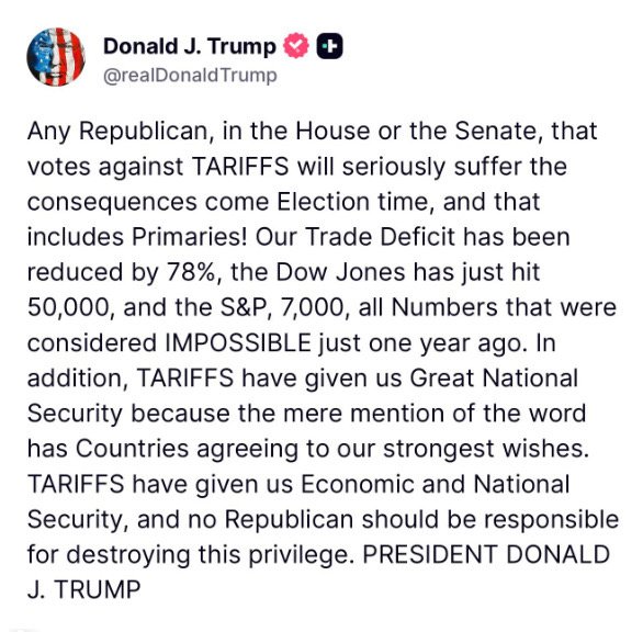 അതിനിടെ തന്റെ വ്യാപാര നയങ്ങളെ ട്രംപ് ശക്തമായി ന്യായീകരിച്ചു ട്രൂത്ത് സോഷ്യലില് കുറിപ്പ് പോസ്റ്റ് ചെയ്തു. ‘നമ്മുടെ വ്യാപാര കമ്മി 78% കുറഞ്ഞു. ഡൗ ജോണ്സ് 50,000-ത്തിലും എസ് ആന്ഡ് പി 7,000-ത്തിലും എത്തിനില്ക്കുന്നു. വെറും ഒരു വര്ഷം മുന്പ് അസാധ്യമെന്ന് കരുതിയ നേട്ടങ്ങളാണിവ,’ ട്രംപ് അവകാശപ്പെട്ടു. താരിഫുകള് രാജ്യത്തിന് സാമ്പത്തിക സുരക്ഷിതത്വവും ദേശീയ സുരക്ഷയും നല്കിയെന്നും അദ്ദേഹം കൂട്ടിച്ചേര്ത്തു.